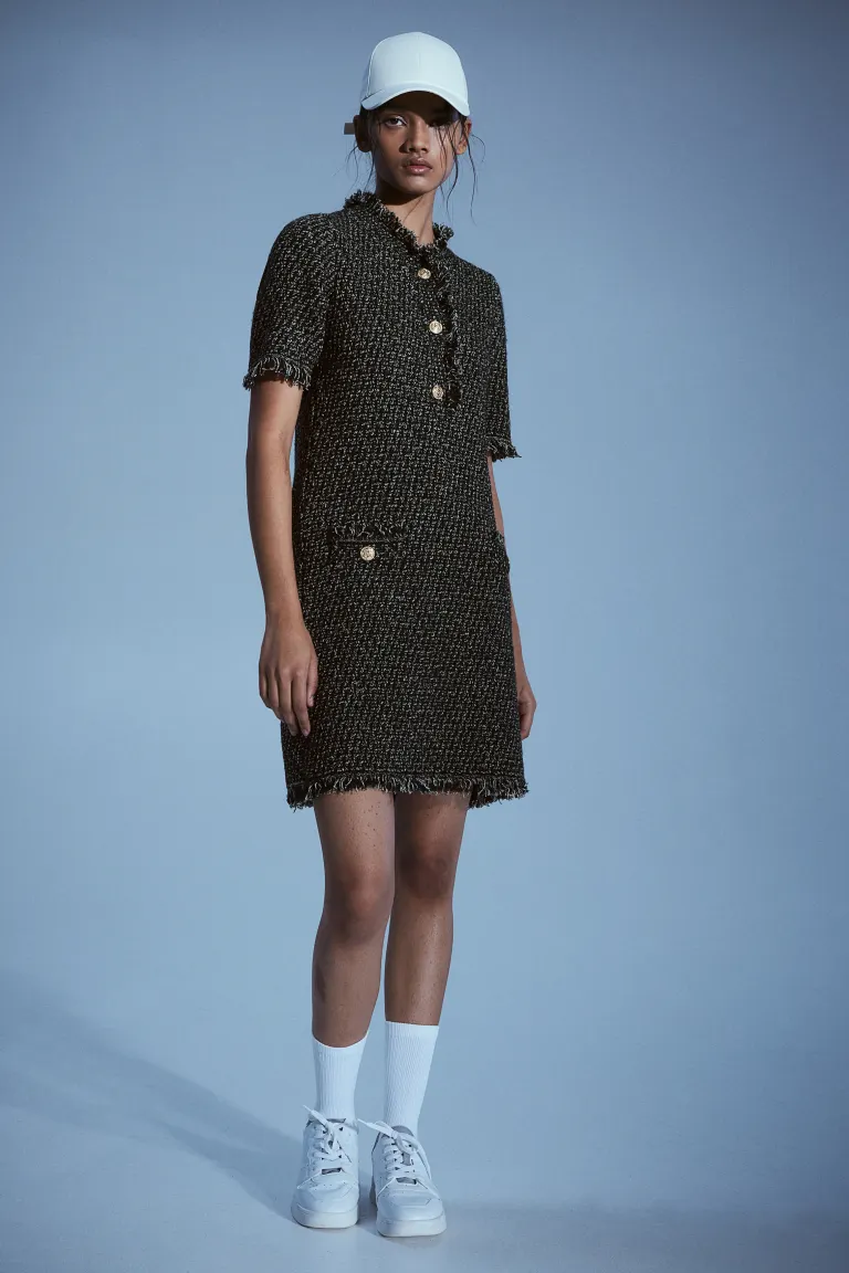 Short, fitted dress in a textured knit with fringe trims. Round neckline, a button placket with metal buttons, short sleeves and fake front pockets with metal buttons.