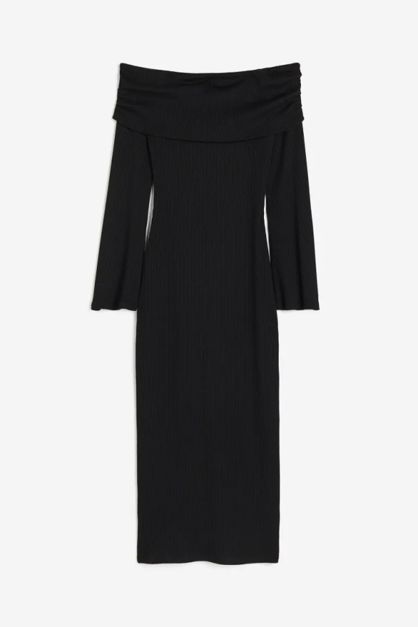 Calf-length, fitted dress in ribbed jersey that has a wide foldover at the top with gathered side seams, long sleeves and a straight-cut hem.