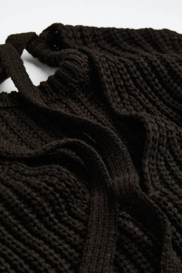 Short, oversized dress in a soft knit with a round neckline and a deep, V-shaped opening with wide ties at the back. Dropped shoulders, long sleeves and ribbing around the neckline, cuffs and hem.